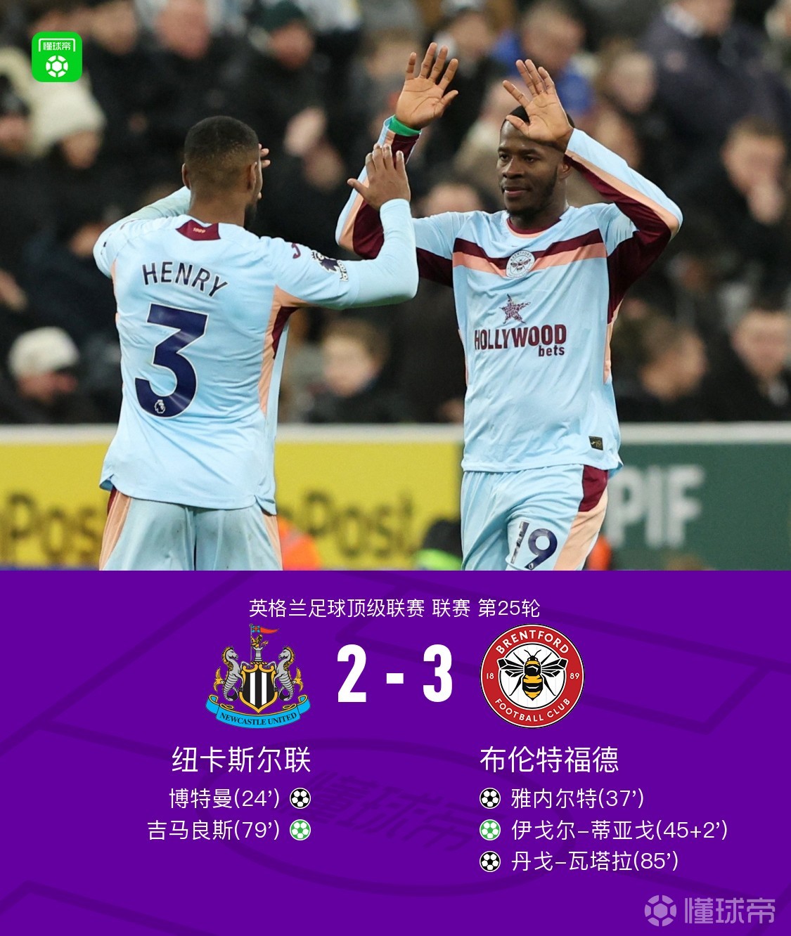 第86分鐘,瓦塔拉勁射破門,幫助球隊再度領(lǐng)先,紐卡2-3布倫特福德