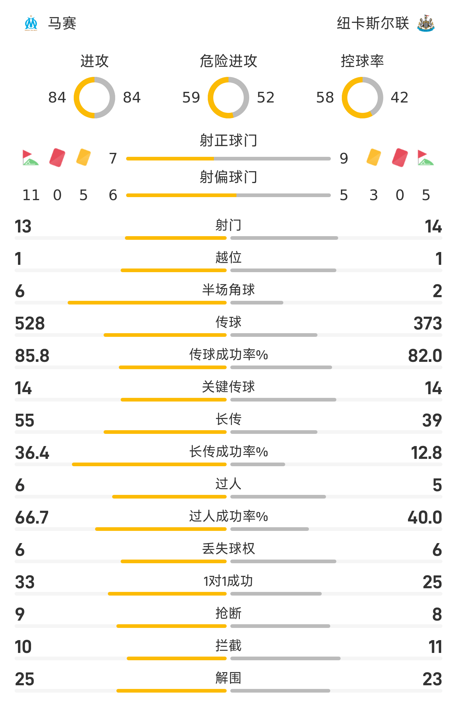 雷速體育11月26日訊 25/26賽季歐冠聯(lián)賽第5輪,馬賽對陣紐卡斯?fàn)柭?lián)。第6分鐘,紐卡獲得夢幻開局,托納利反越位成功送出傳中,巴恩斯包抄抽射破門。下半場開場僅20秒,巴科拉直塞前場,奧巴梅揚晃過魯莽出擊的波普將球打進空門,馬賽1-1紐卡。4分鐘后,維阿右路突破傳中,奧巴梅揚鬼魅般殺出搶前點打上角得手,馬賽2-1反超紐卡。此后雙方均無力改寫比分,最終馬賽在主場以2-1逆轉(zhuǎn)擊敗紐卡斯?fàn)柭?lián)。