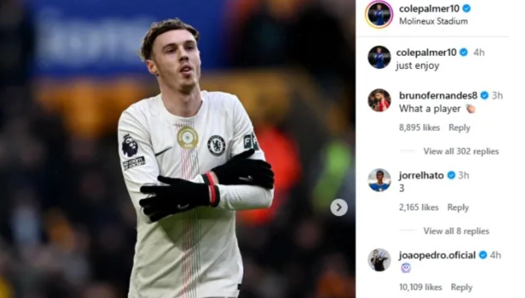 賽后,帕爾默向切爾西球迷發(fā)文致意,附上了多張他在戰(zhàn)勝狼隊比賽中的慶祝照片,并配文:“盡情享受就好。”