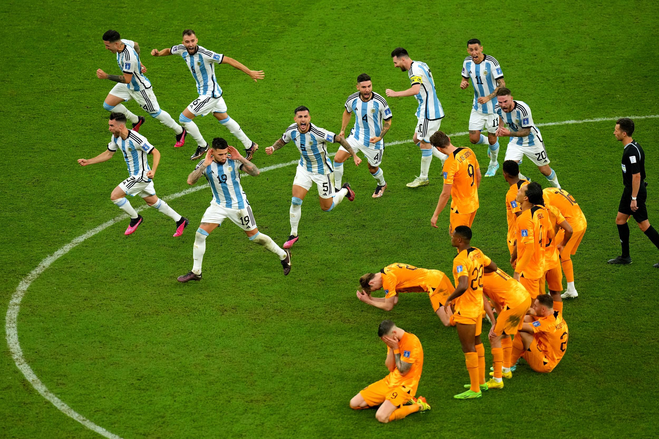 2022年12月9日,世界杯1/4決賽,荷蘭與阿根廷踢出了一場瘋狂的2-2,阿根廷4-3點(diǎn)球取勝晉級(jí)。本場雙方多次爆發(fā)沖突,點(diǎn)球大戰(zhàn)決勝瞬間,阿根廷球員瘋狂慶祝,荷蘭球員則黯然神傷。