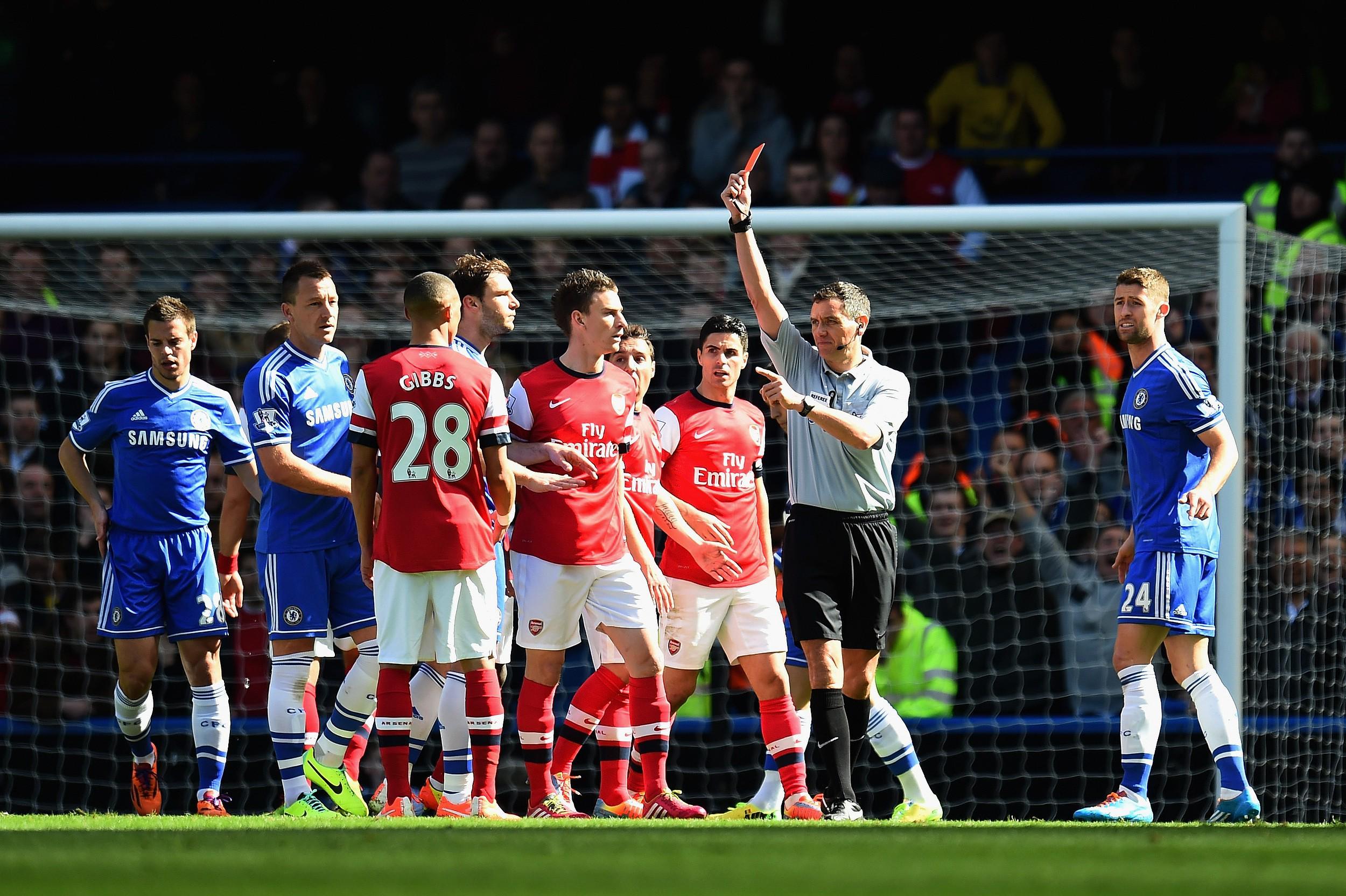 2014年3月22日,英超第31輪,切爾西6-0大勝阿森納。第15分鐘,張伯倫禁區(qū)內(nèi)手球犯規(guī),但當(dāng)值主裁判馬里納卻罰下了與張伯倫長相相近的吉布斯,并且無視了張伯倫的主動(dòng)坦白。