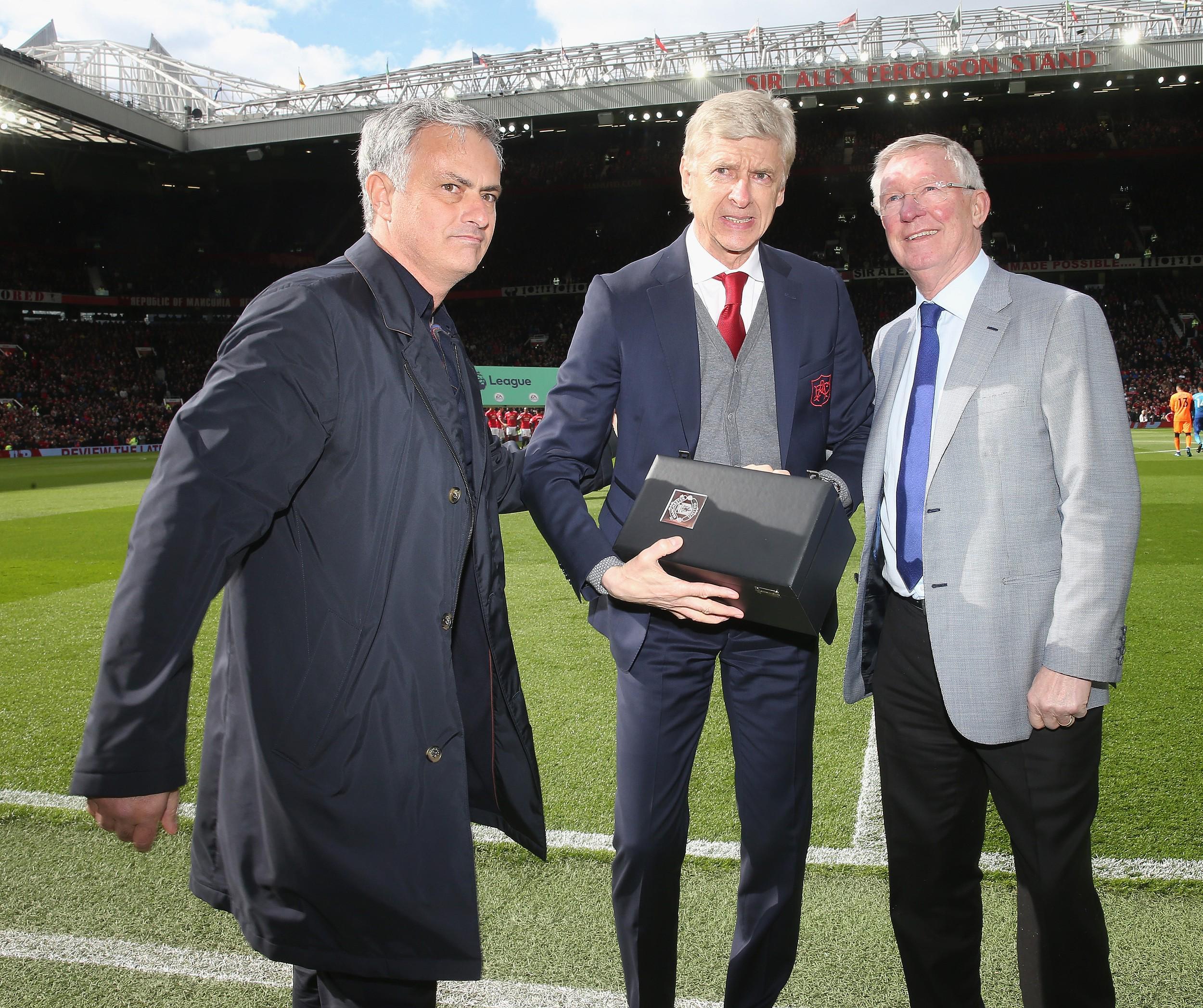 2018年4月29日,英超第36輪,阿森納前往老特拉福德客戰(zhàn)曼聯(lián)。賽前,弗爵爺代表曼聯(lián)為老對(duì)手溫格送上告別禮物,穆里尼奧也向這位宿敵致意。爵爺、教授、狂人同框,他們?cè)谝黄穑褪怯⒊?/p>