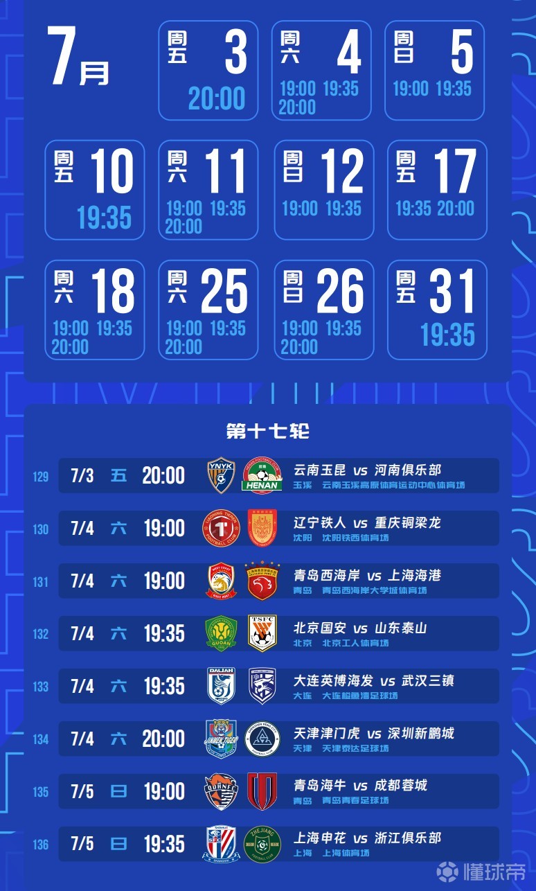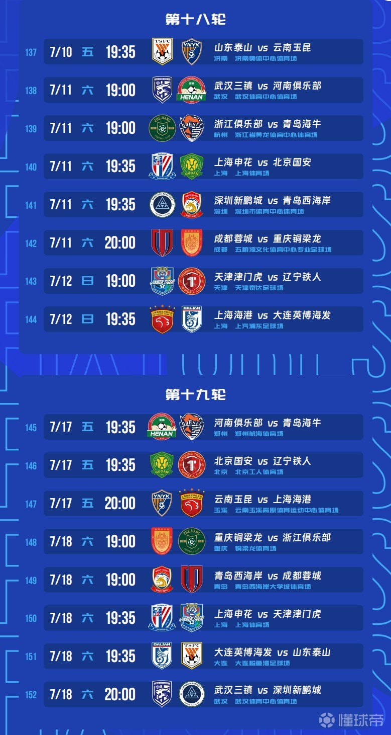 根據(jù)賽程安排,海港、申花和山東都是1主3客的賽程,其中衛(wèi)冕冠軍上海海港從第16輪起,將連續(xù)做客河南和青島西海岸,第18輪主場(chǎng)對(duì)陣大連英博,第19輪客場(chǎng)對(duì)陣云南玉昆。上賽季聯(lián)賽亞軍上海申花,將先后對(duì)陣大連英博、浙江隊(duì)、北京國(guó)安和天津津門(mén)虎,只有對(duì)陣大連英博是在客場(chǎng)。上賽季的足協(xié)杯冠軍北京國(guó)安將迎來(lái)魔鬼賽程,在7月4日和7月11日先主后客對(duì)陣山東泰山和上海申花。