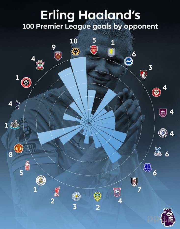 哈蘭德達(dá)成英超百球里程碑,英超官方也曬出哈蘭德百球攻破球門對手分布。