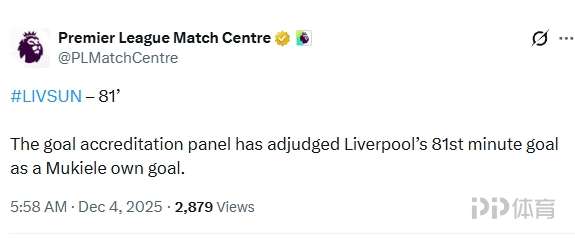 英超第14輪利物浦1-1戰(zhàn)平桑德蘭,第81分鐘,維爾茨射門擊中穆基勒入網(wǎng),但這球隨后被英超官方認(rèn)定為穆基勒的烏龍球!