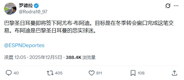 在社交媒體上,Rodra表示,布阿迪是巴黎圣日耳曼的球迷,他加盟巴黎的轉(zhuǎn)會可能將在冬季完成,這一消息吸引了400條以上的轉(zhuǎn)發(fā)和熱議。