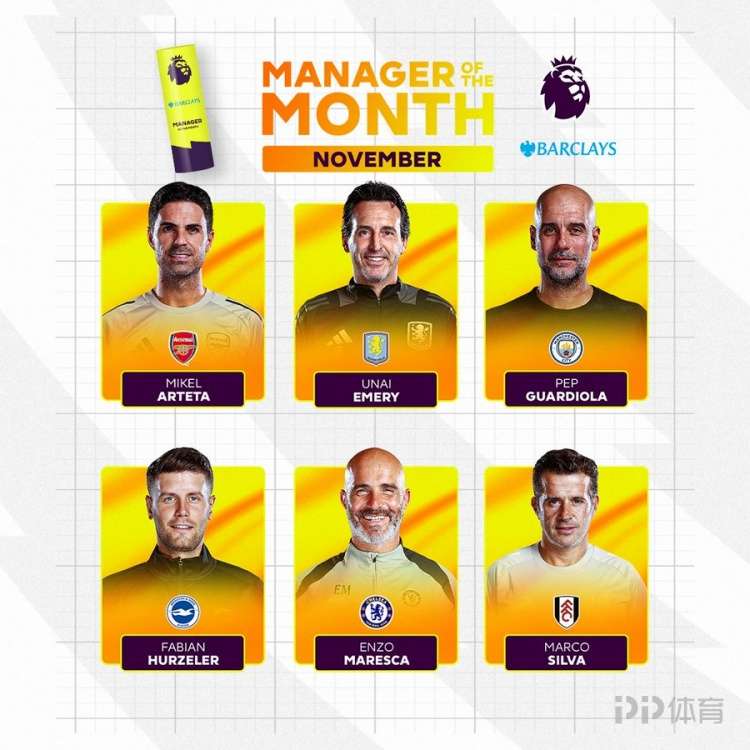 英超官方公布11月最佳主帥候選,阿爾特塔、瓜迪奧拉、馬雷斯卡等6名教練入圍。