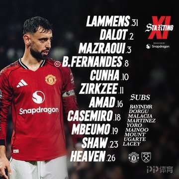 曼聯(lián)首發(fā):31-拉門斯、26-海文、2-達洛特、3-馬茲拉維、23-盧克-肖、8-B費、18-卡塞米羅、16-迪亞洛、11-齊爾克澤、19-姆伯莫、10-庫尼亞