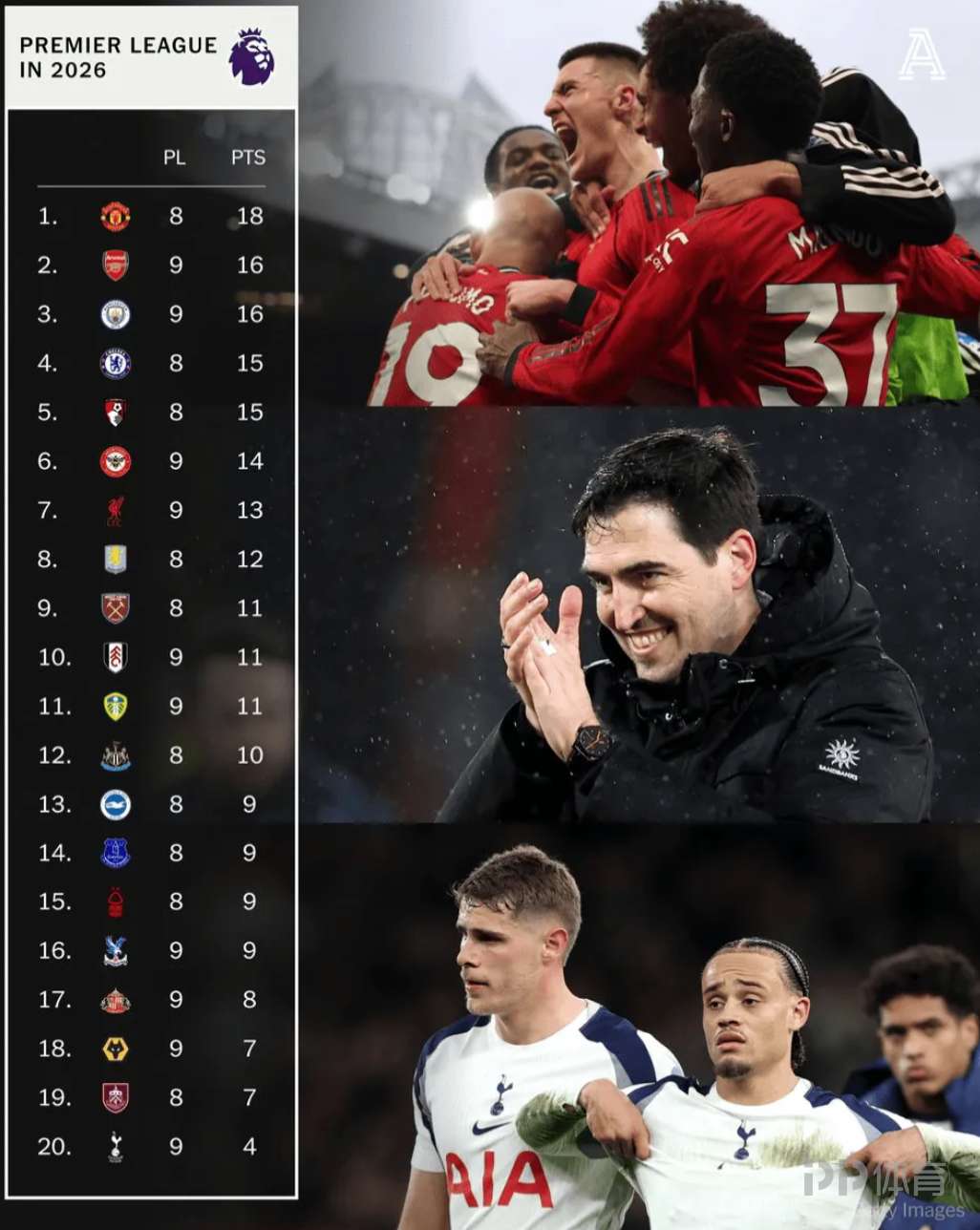 英超“2026自然年”積分榜更新:曼聯(lián)以8場18分領(lǐng)跑,同時(shí)也是2026年以來聯(lián)賽唯一保持不敗的球隊(duì)。身后阿森納、曼城同為9場16分緊追,熱刺僅拿到9場4分排名墊底,并且是2026年英超唯一仍未取勝的球隊(duì)。