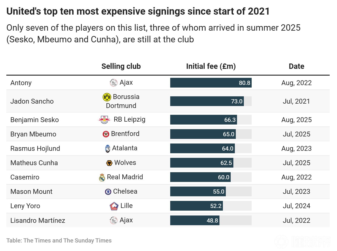 報告指出,從2021年初至2025年底,曼聯(lián)在轉(zhuǎn)會市場上的凈支出達到7.94億歐元(約6.92億英鎊)。這一數(shù)據(jù)凸顯了球隊在此期間競技表現(xiàn)不佳所付出的高昂代價。根據(jù)《2025俱樂部財務(wù)與投資格局報告》,凈支出排名第二的是切爾西足球俱樂部(6.56億英鎊),第三為阿森納足球俱樂部(5.87億英鎊)。