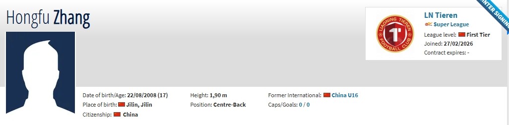 德轉(zhuǎn)顯示,遼寧鐵人以12.4萬歐元,約100萬人民幣簽下張洪福。