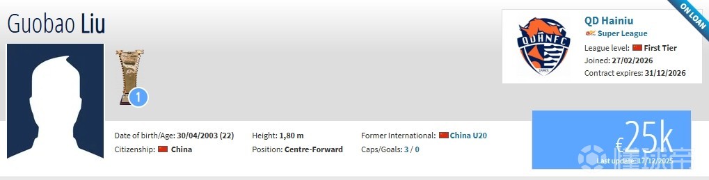 德轉(zhuǎn)顯示,劉國(guó)寶的租借費(fèi)為5萬(wàn)歐元,約40萬(wàn)人民幣。現(xiàn)在他的身價(jià)為2.5萬(wàn)歐元。