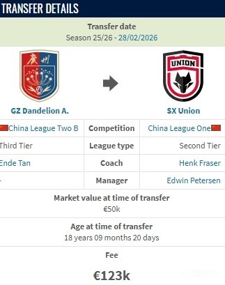 德轉(zhuǎn)顯示,陜西聯(lián)合花費(fèi)約100萬人民幣從廣州蒲公英簽下郭五岳。