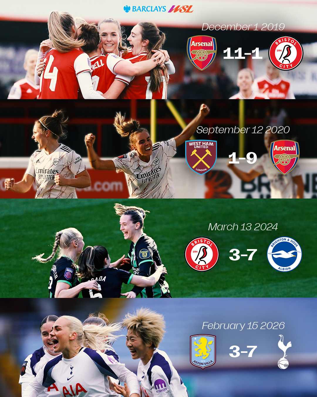 進(jìn)球!進(jìn)球!進(jìn)球!在巴克萊女子超級(jí)聯(lián)賽的歷史上,只有四場比賽的單場進(jìn)球數(shù)達(dá)到或超過10個(gè),阿森納女足獨(dú)占兩場