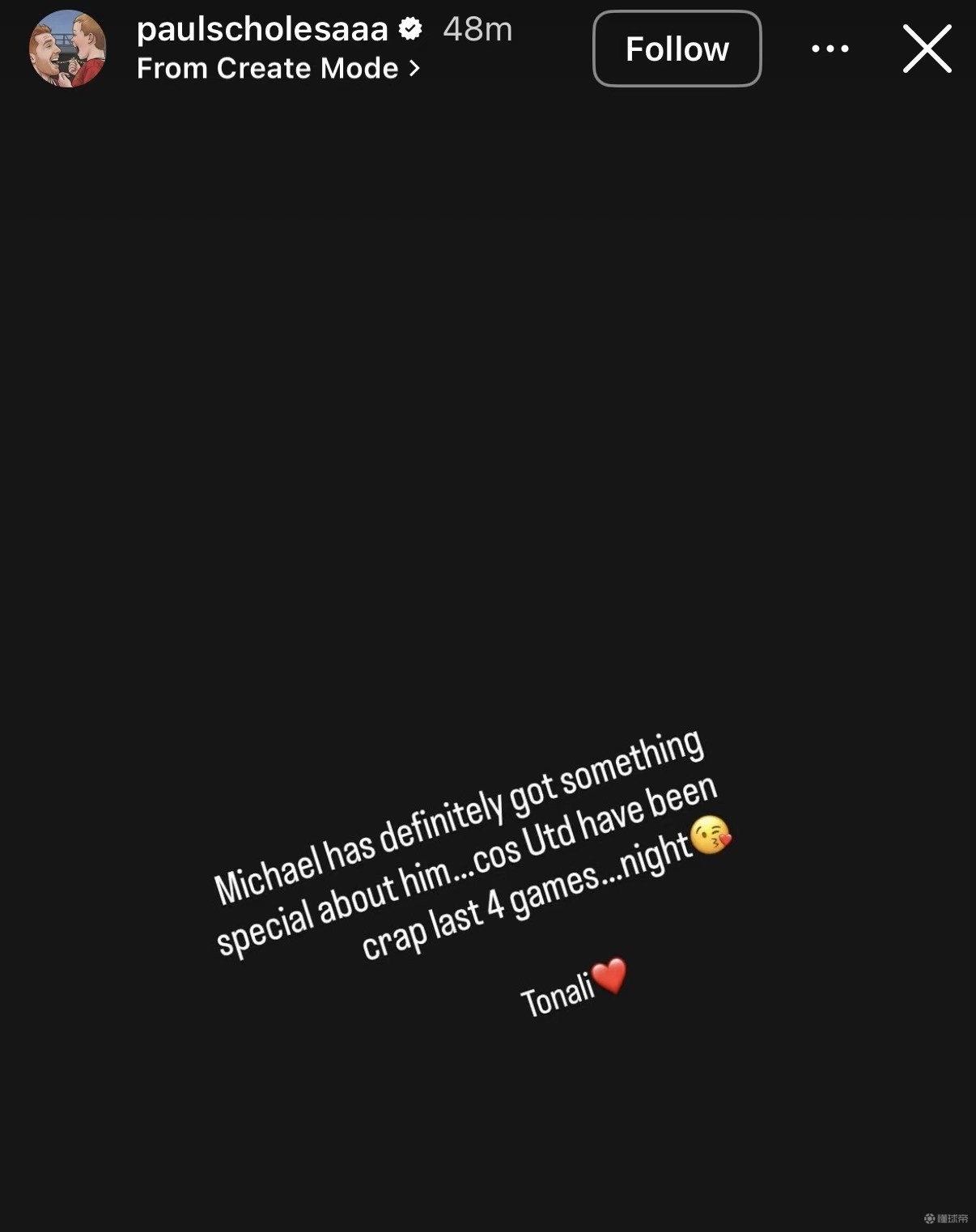 斯科爾斯在社交媒體發(fā)表動(dòng)態(tài),寫(xiě)道:“邁克爾(卡里克)身上肯定有某種特別之處,因?yàn)槁?lián)最近四場(chǎng)比賽踢得簡(jiǎn)直爛透了……晚安
