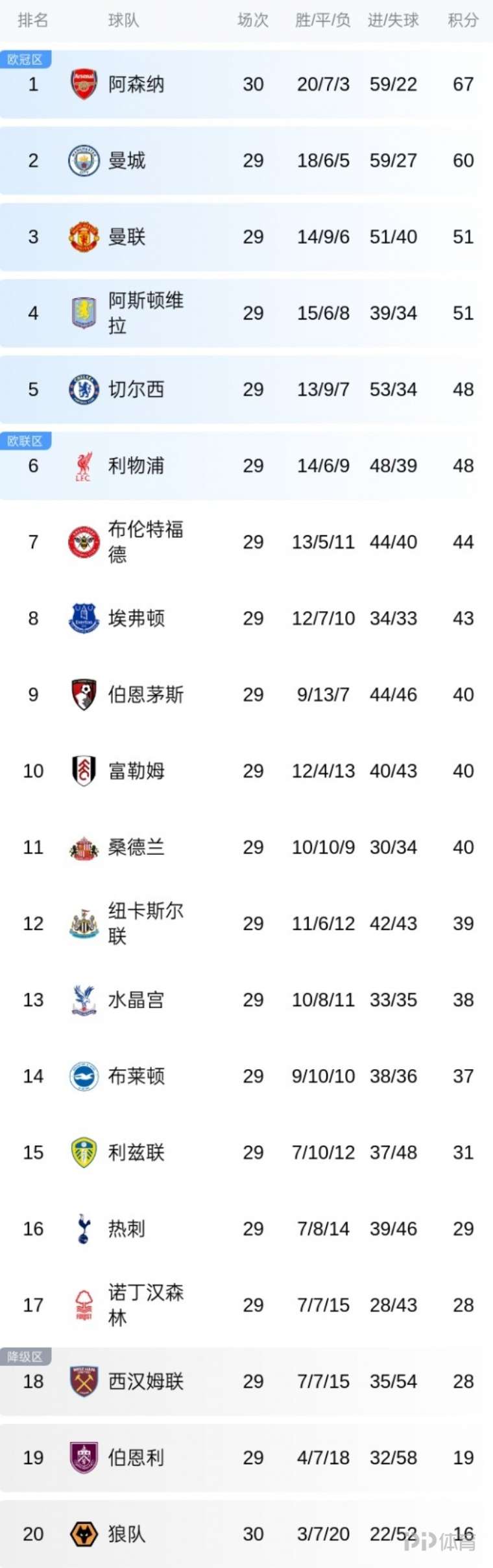 隨著今日凌晨熱刺不敵水晶宮,英超第29輪比賽已經(jīng)全部結(jié)束。