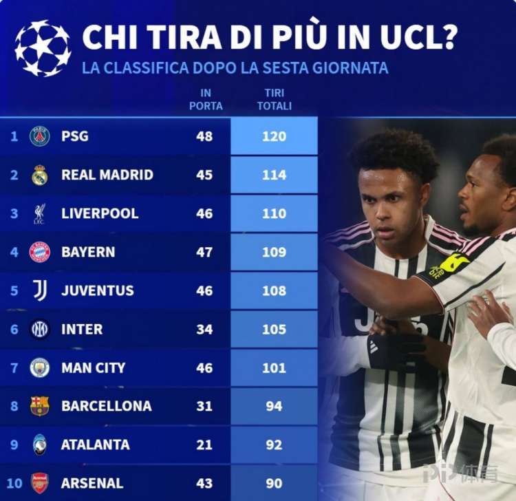 德國轉(zhuǎn)會市場統(tǒng)計了本賽季歐冠各隊的射門次數(shù),并列出榜單,巴黎120次射門居首,皇馬、利物浦二三位。
