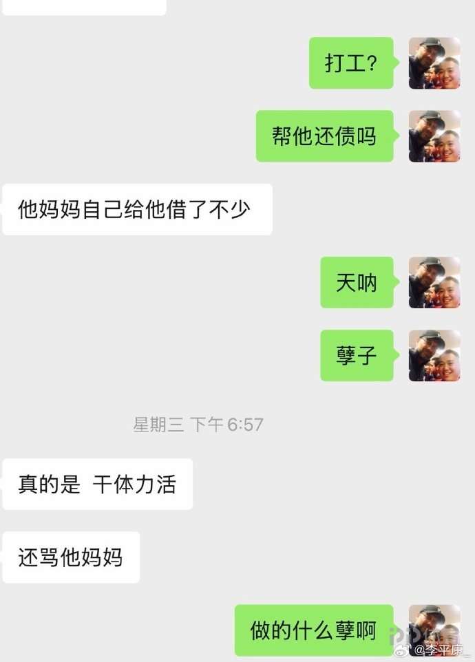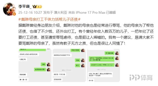 李平康曬出了多張聊天截圖表示:據(jù)戴琳曾經(jīng)身邊朋友介紹,戴琳對(duì)他的母親也是經(jīng)常進(jìn)行辱罵,他的母親為了幫他還債,也借了不少錢,還外出打工。有個(gè)曾經(jīng)年收入數(shù)百萬的兒子,一把年紀(jì)了還要打工還債,甚至遭受辱罵虐待,也是挺讓人唏噓的。我有一個(gè)建議,懇請(qǐng)大家不要罵戴琳的母親了,雖然有教子無方之責(zé),但也是很讓人同情了!