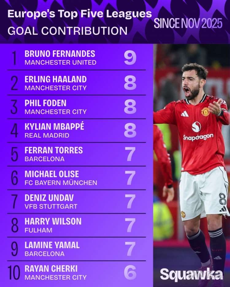 據(jù)Squawka統(tǒng)計(jì),B費(fèi)今年11月以來(lái)聯(lián)賽參與9粒進(jìn)球,五大聯(lián)賽同期參與進(jìn)球最多。