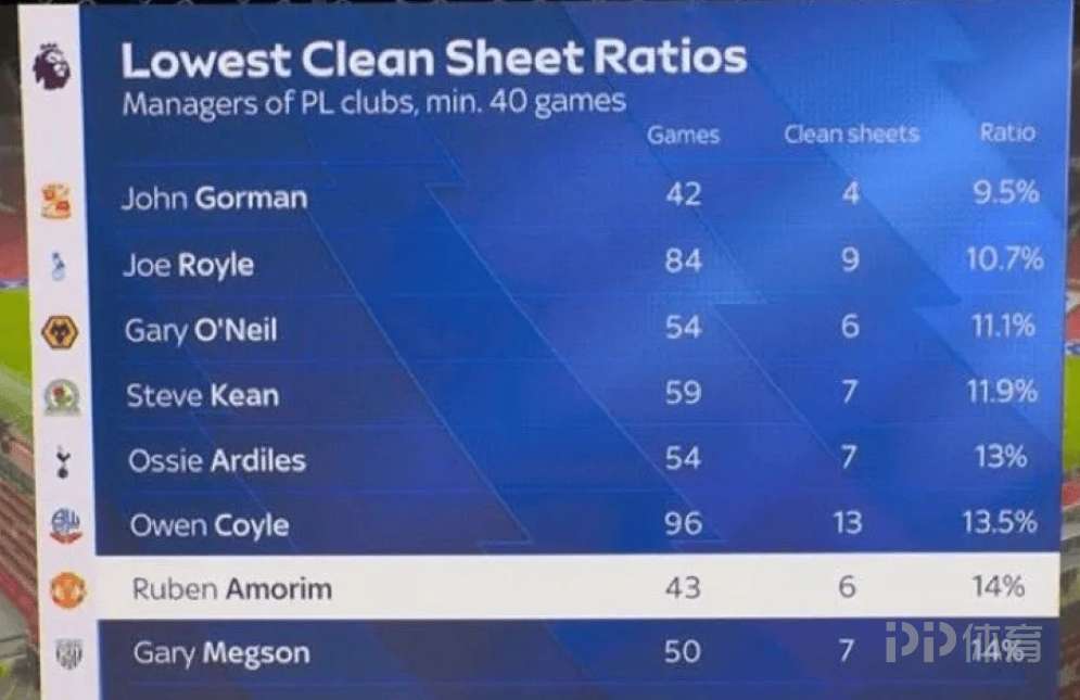 天空體育在節(jié)目中給出一組數(shù)據(jù)統(tǒng)計:在英超執(zhí)教場次不少于40場的主教練里,阿莫林擠進“零封比例”最低榜歷史前第7。