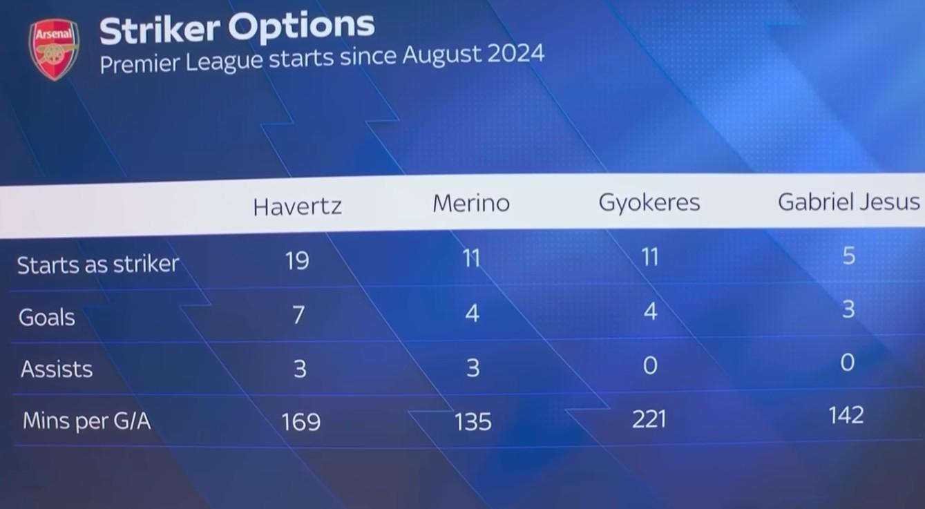 主持人:阿爾特塔現(xiàn)在的確擁有更多選擇,可以說是四種鋒線方案:熱蘇斯已經(jīng)回歸,哈弗茨也預(yù)計(jì)在2026年初、也就是幾周后復(fù)出。這是他們自上賽季以來在英超的數(shù)據(jù)貢獻(xiàn)。底部顯示的是這四名球員“每分鐘參與進(jìn)球(進(jìn)球+助攻)”的效率。可以看出,梅里諾目前可能是效率最高的,而哲凱賴什暫時(shí)最低。在這四人中,你認(rèn)為阿爾特塔最終會(huì)依靠誰幫助球隊(duì)贏得本賽季冠軍?