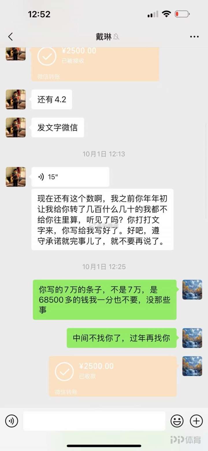媒體人孫德信曬出了兩張關(guān)于戴琳的聊天記錄截圖,并且指責(zé)戴琳疑似“想賴賬”。