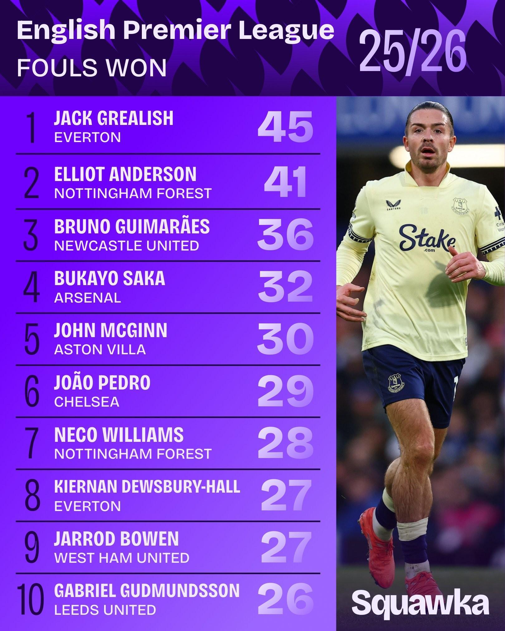 當(dāng)?shù)貢r間12月18日,知名數(shù)據(jù)機(jī)構(gòu)Squawka發(fā)布了2025/26賽季英超聯(lián)賽被犯規(guī)次數(shù)榜(截至第16輪),埃弗頓球員格拉利什被犯規(guī)45次位居榜首。