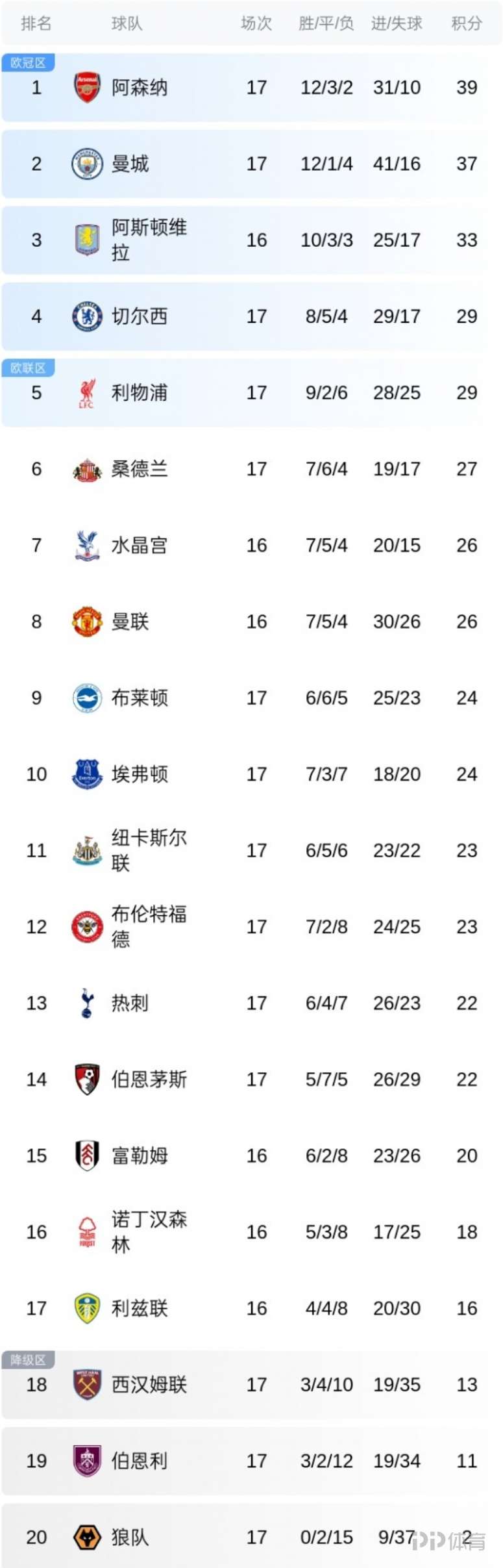 英超第17輪,阿森納1-0埃弗頓,最新的積分榜方面:阿森納依舊2分領(lǐng)跑,曼城37分第2,維拉33分第3,本輪主場迎戰(zhàn)曼聯(lián);切爾西第4,利物浦暫升第5。