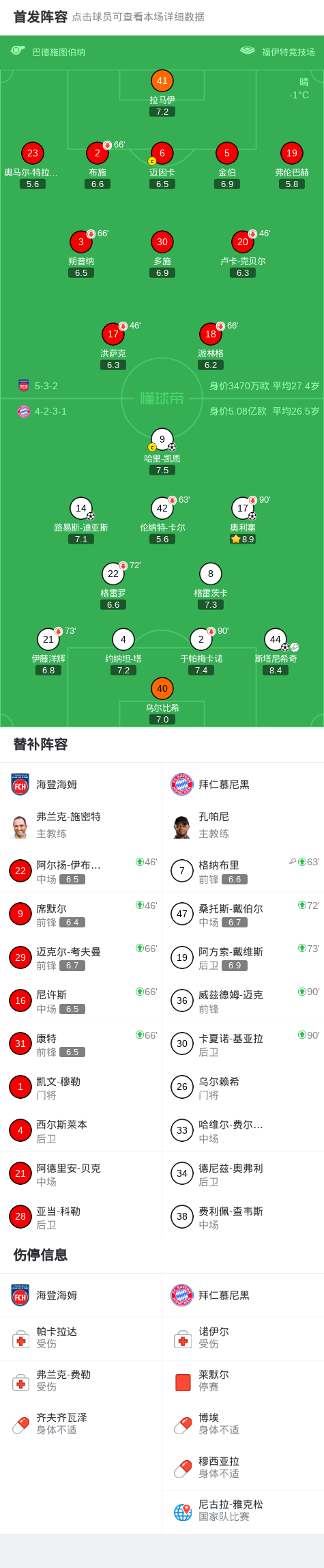 北京時間12月22日德國足球頂級聯(lián)賽 聯(lián)賽 第15輪,海登海姆主場對陣拜仁慕尼黑。上半場拜仁角球,斯塔尼希奇頭球破門,之后拉馬伊被隊友撞倒,伊藤洋輝傳球變線,奧利塞破門。下半場尾聲斯塔尼希奇?zhèn)髦校蟻喫垢┥眍^球破門,補(bǔ)時階段格納布里傳球,凱恩禁區(qū)內(nèi)晃動后低射破門。最終拜仁4-0戰(zhàn)勝海登海姆。